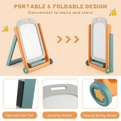 - Portable & Foldable Design: This kids art easel can be folded into a compact size in seconds, convenient to move and store. Plus, built with 2 rolling wheels, even kids are able to move the easel without effort. In addition, the top of the easel and chair are both designed with carrying handle for easy transport.