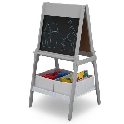Spark artistic play with the MySize Double-Sided Storage Easel from Delta Children. This two-sided easel for kids features three different drawing surfacesβa chalkboard on one side, a magnetic dry-erase whiteboard on the other, and a pull down paper roll on top (33 feet of paper included). Just the right height for growing artists, this kids easel encourages creativity and allows little ones to develop their fine motor skills through painting, drawing, coloring and writing. Two storage bins underneath the easel keep art supplies neat and nearby. Available in a number of beautiful colors. Coordinates with other items in the MySize Collection from Delta Children.