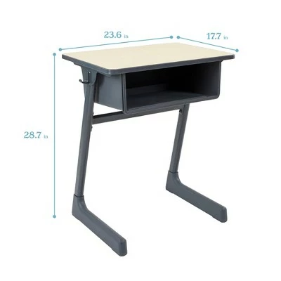The Cave Open Front Desk is the perfect addition to schools, classrooms and home learning spaces. This student desk is designed with a cantilever frame that provides ergonomic support and gives learners ample leg room. The base is free of any low crossbars making it easy to keep your floors clear and free of clutter. A spacious plastic book box with a built-in pencil groove helps you stay organized by holding textbooks, folders, papers and writing utensils. Two hooks keep backpacks and personal belongings organized. Constructed with high-quality materials to withstand everyday use, the durable tabletop is finished with an edge banding that provides added protection against dirt and moisture. Angled legs have a rubber foot base and adjustable leveling glides that provide stability and protect your flooring. Desk is easy to clean by wiping down with a mild soap-and-water solution or your favorite bleach-free wipe. Arrives ready-to-assemble and requires minimal adult assembly. Desks are GREENGUARD [GOLD] Certified for low VOCs, CPSIA compliant and feature rounded edges for safety. At ECR4Kids, weโre committed to safety, testing and regulatory compliance to ensure our products meet or exceed industry standards. You and your kids deserve the absolute best for a brighter way to play, share, learn and grow.