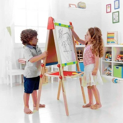 Watch as your children paint, write, or draw their next award winner on this Hape Magnetic All in 1 double sided wooden easel. This kids art easel is height adjustable between 37.5 to 43.5 inches, so it can be set at the perfect height just for them. Their next art project is only a reach away with the attached paper roll and their paint will never be out of reach with the 3 paint pots and holders. Do you have the next Andy Warhol, Georgia O’Keeffe, or Vincent Van Gogh on your hands? Let their imaginations flourish with the Hape Magnetic All in 1 easel.
