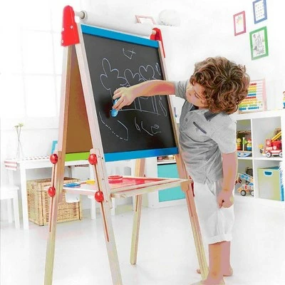 - Double-sided easel with blackboard, magnetic whiteboard, and paper roll on top