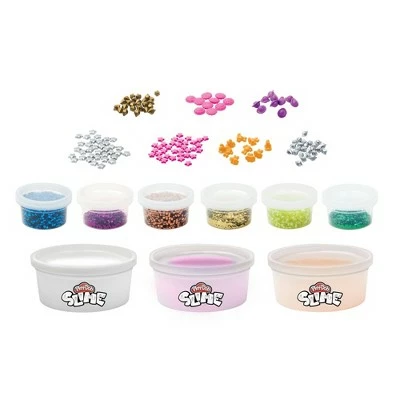 Includes 3 cans of glitter, 3 cans of bingsu beads, 3 pouches of charms, and 3 cans of Play-Doh Slime compound (net weight 13.5 oz/382.7 g).