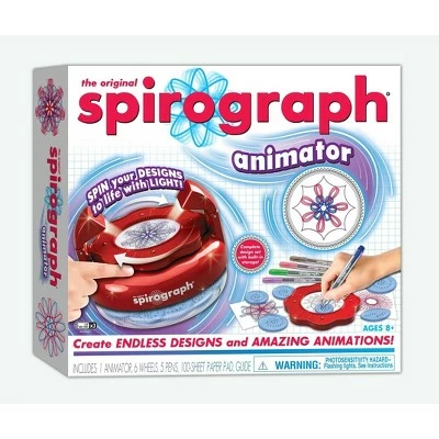 Take a new spin on the classic Spirograph design set with Spirograph Animator! The classic way for aspiring artists to create millions of amazing designs is back and better than ever! Create endless spiral art designs and then bring them all to life in amazing, mesmerizing motion with a spin of the animator. Every design moves in a different way with each of the rotating light effects. The design and animation possibilities are endless!